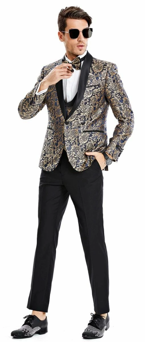 Tazio Men’s 3 Piece Skinny Fit Suit – Gold Paisley