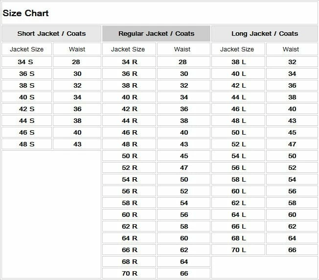 | Size | 36R, 38R, 40R, 42R, 44R, 46R, 48R, 36S, 38S, 40S, 42S, 44S, 46S, 48S, 38L, 40L, 42L, 44L, 46L, 48L, 50R, 52R, 54R, 56R, 50L, 52L, 54L, 56L |